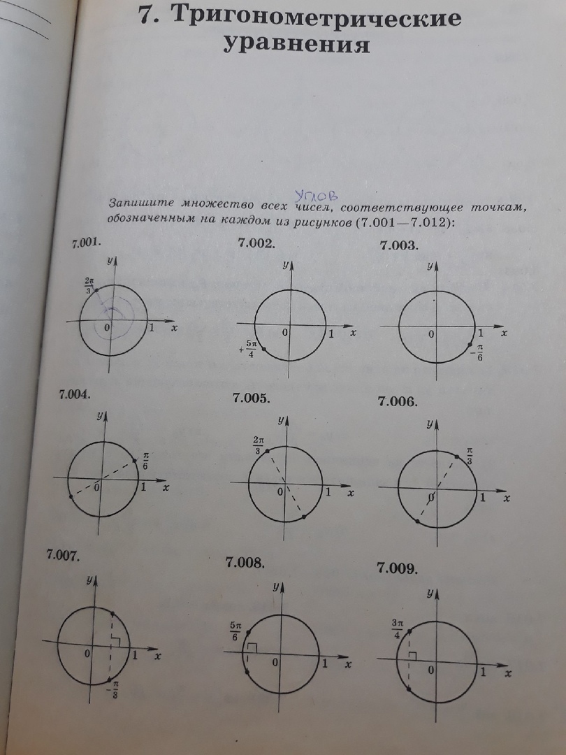 Запишите множество всех углов (чисел) соответствующих точкам, обозначенным на каждом из рисунков