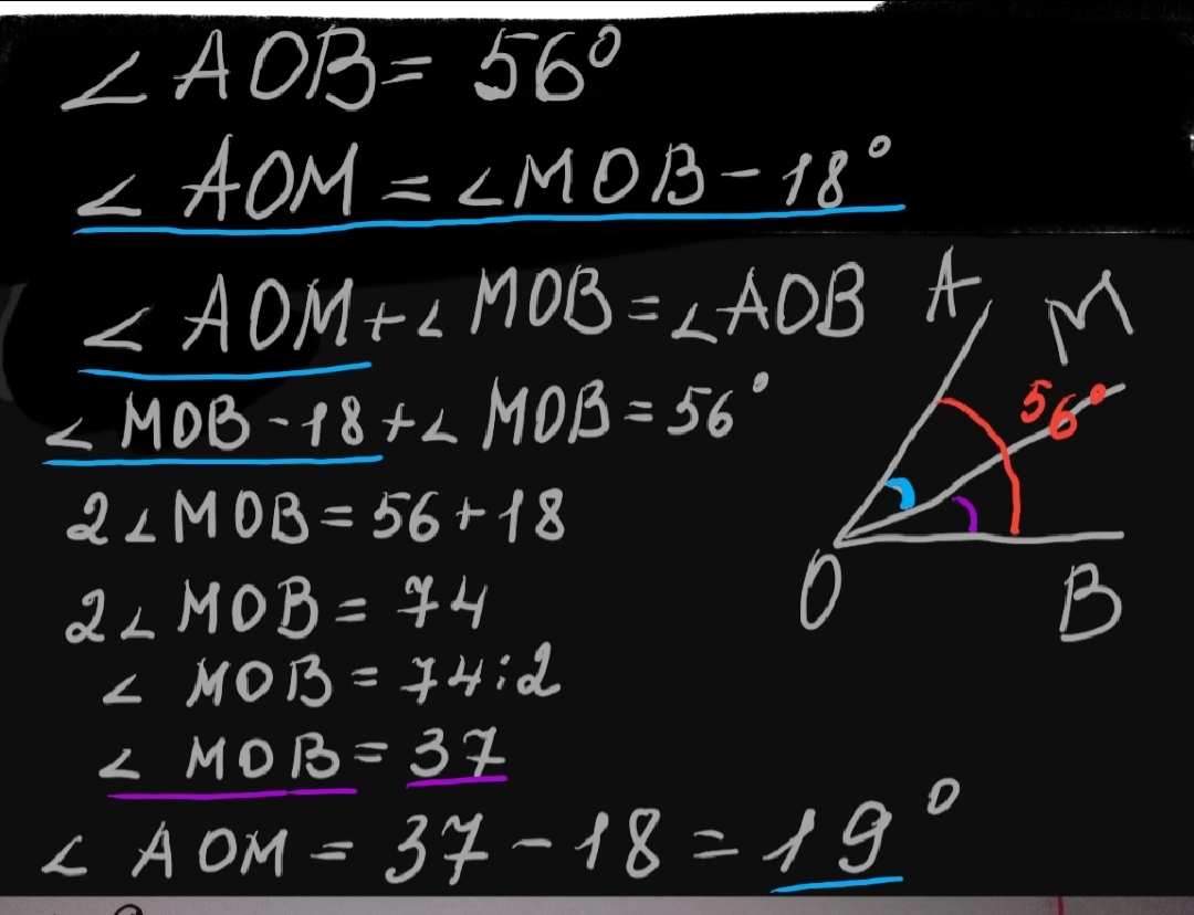 Луч OM проходит между сторонами кутаAOB =56° так,что кут АОB на 18° меньше кута MОB. Найдите градусную меру кутаAOB и кутаMOB.Пожалуйста,с рисунком.Прошууу