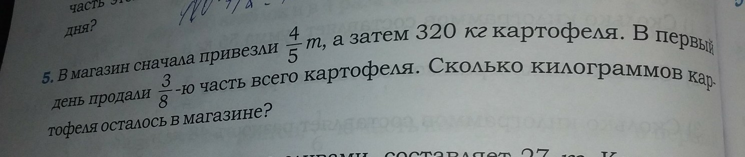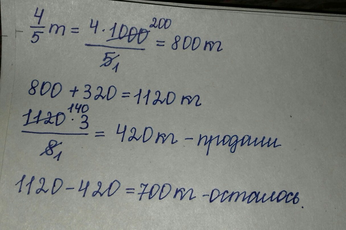 магазин сначала привезли 4/5 тонн а затем 320 кг картофеля В первый день продали 3/8 часть всего картофеля Сколько килограммов картофеля осталось в магазине?