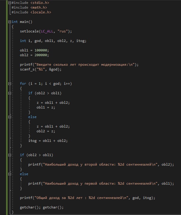 printf("Общий доход за %2d лет : %2d сентиннеалейn", god, itog);
