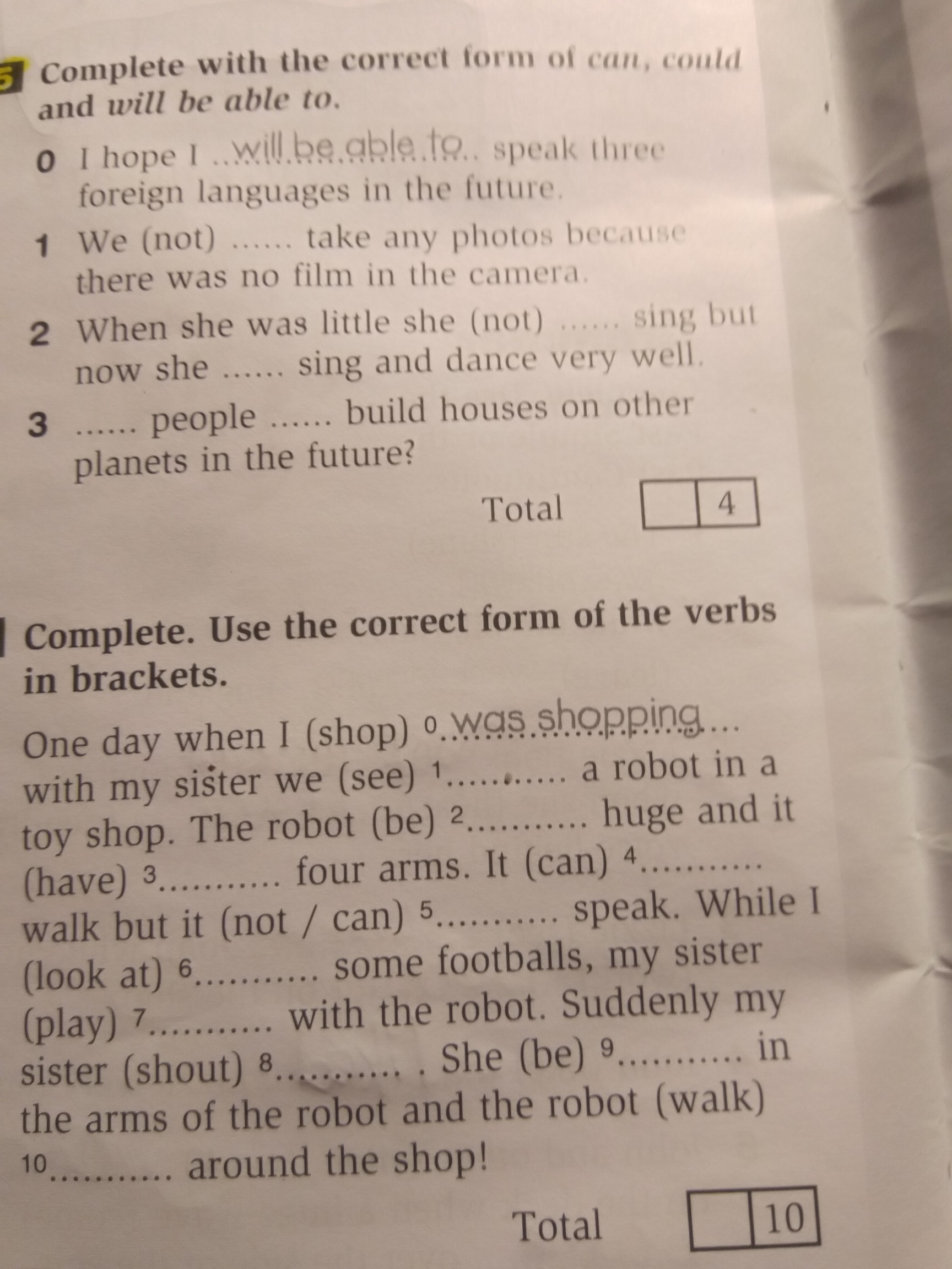 One day whe I was shopping with my sister we saw a robot in a toy shop. The robot was huge and it had four arms. It could walk but it couldn't speak. While I was looking at some footballs, my sister was playing with the robot. Suddenly my sister shouted. She was in the arms of the robot and the robot was walking around the shop!