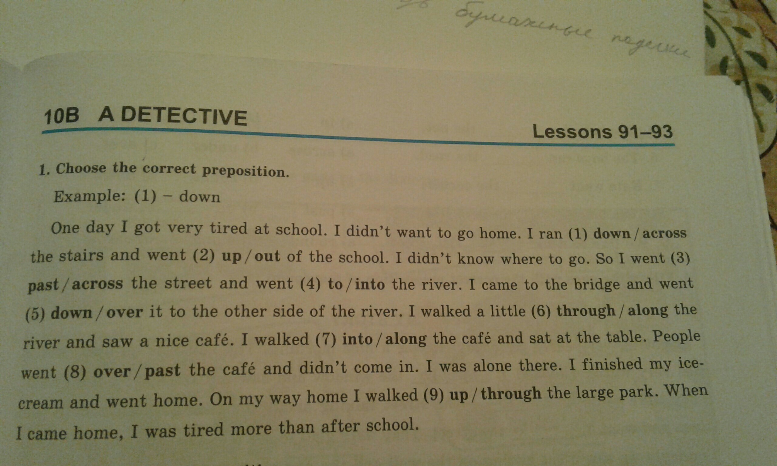 Однажды я очень устал в школе. я не пошел домой. я пошел вниз по ступенькам и вышел из школы. я не знал, куда идти. в итоге я пошел через улицу к реке. я подошёл к мосту и прошел по нему на другую сторону реки. я погулял немного вдоль реки и увидел симпатичное кафе. я зашёл в кафе и сел за стол. люди проходили мимо и не заходили внутрь. я доел мороженое и пошел домой. на пути домой я прошел через большой парк. придя домой я почувствовал себя более усталым, чем после школы.
