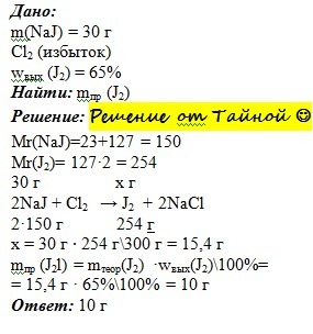 какую массу йода можно получить из 30 грамм иодида натрия действием избытка хлорной воды, если выход продукта реакции составляет 65%?