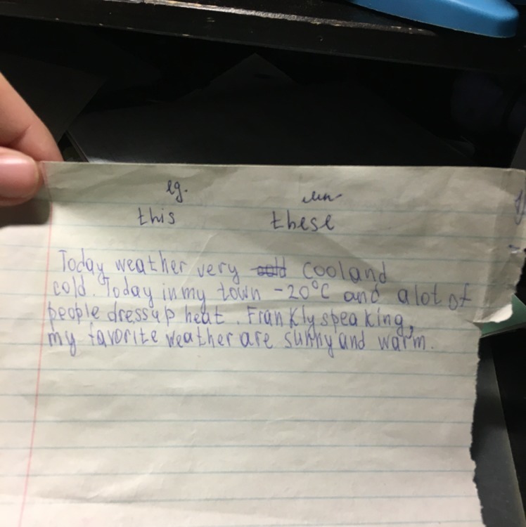 look through the window and write five sentences to answer the question: What's the weather like today?