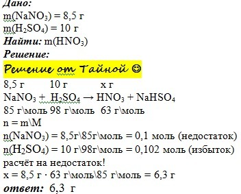 Для получения азотной кислоты взяли 8,5 грамм нитрата натрия и 10 грамм серной кислоты.Сколько азотной кислоты получилось используйте следующие формулы