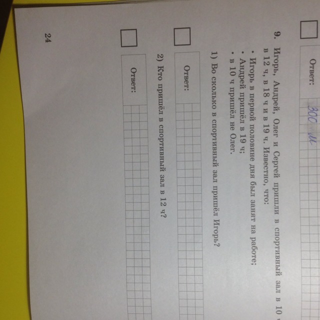 Игорь,Андрей,Олег и Сергей пришли в спортивный зал в 10 ч, в 12ч, в 18 ч и в 19 ч. Известно, что: • Игорь в первой половине дня был занят на работе; • Андрей пришёл в 19 ч; • в 10 ч пришёл не Олег