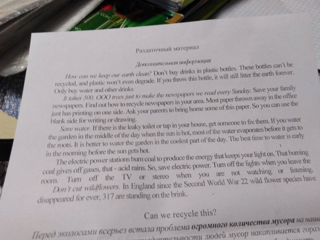Как проследить чтобы был чистым? не покупайте напитки с пластиковыми бутылками. эти бутылки не могут быть утилизированы, а пластик Может вообще испортить. если ты бросишь бутылку, то наша планета будет загрязнена. Только покупайте воду или напитки. Люди пилят 500000 деревьев и делают газеты, чтобы читали каждую воскресенье. Спаси свою бумажную семью. Найди на улице урны для бумаги чтобы бригада приехала и забрали бумагу на утилизацию. Даже просто обычная бумага брошенная в офисе, просто там распечатано в одну сторону. спроси у разрешения родителей можно взять бумагу. поэтому используйте пустую чистую сторону бумаги, чтоб можно писать и рисовать.