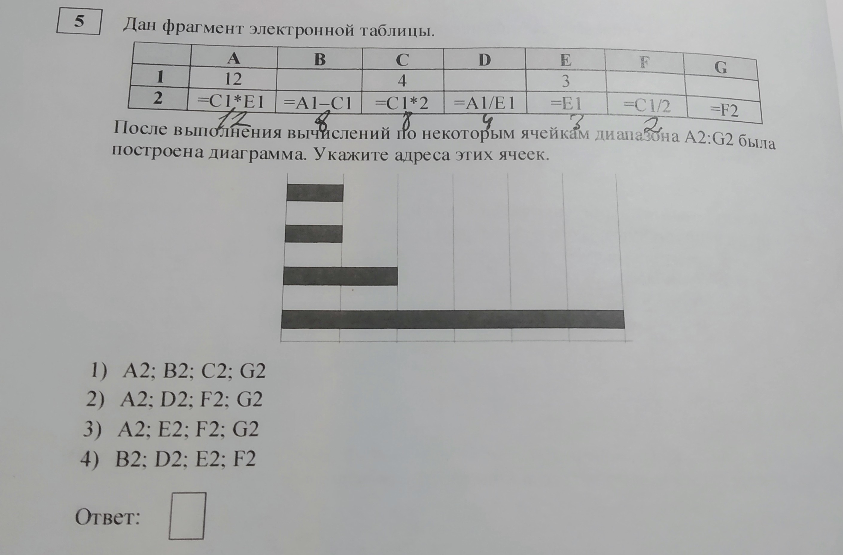 В 5 задании ячейки второй строки подсчитаны верно, и если представить, что на графике одно деление равно 2, то получается, что необходима последовательность 12-4-2-2, а если ячейка G2 так же равна 2, то подходит второй вариант A2;D2;F2;G2