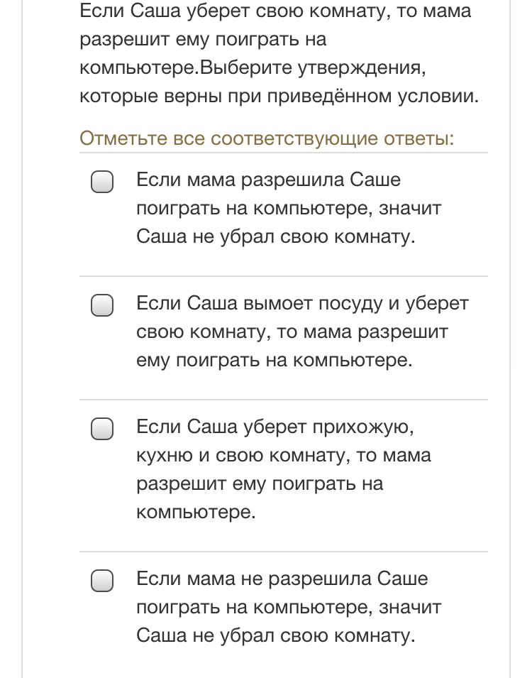 Если Саша уберет свою комнату, то мама разрешит ему поиграть на компьютере.Выберите утверждения, которые верны при приведённом условиях