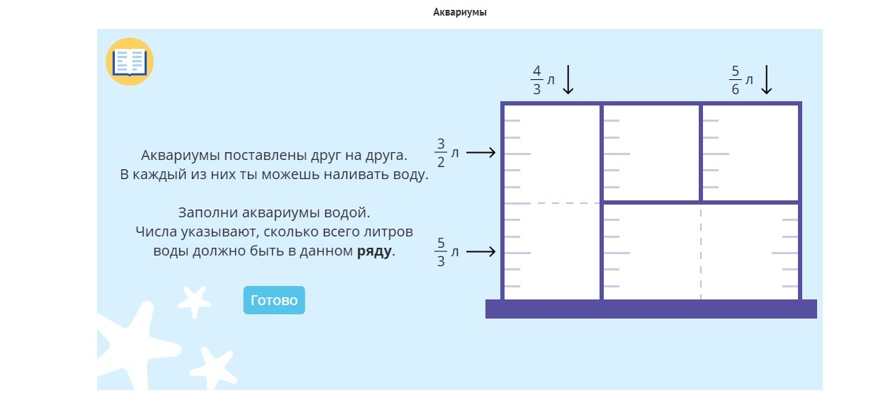 Помогите, пожалуйста. Аквариумы поставлены друг на друга. в каждый из них ты можешь наливать воду. заполни аквариумы водой. Числа указывают, сколько всего литров воды должно быть в данном ряду.