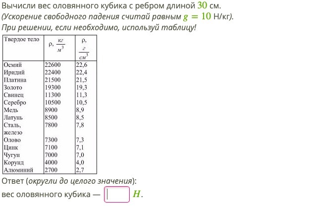 P = mg; m = p*V; V = a³; P = p*a³*g = 7300*0,3³*10 = 7300*0,027*10 = 7300*0,27 = 1971 Н.