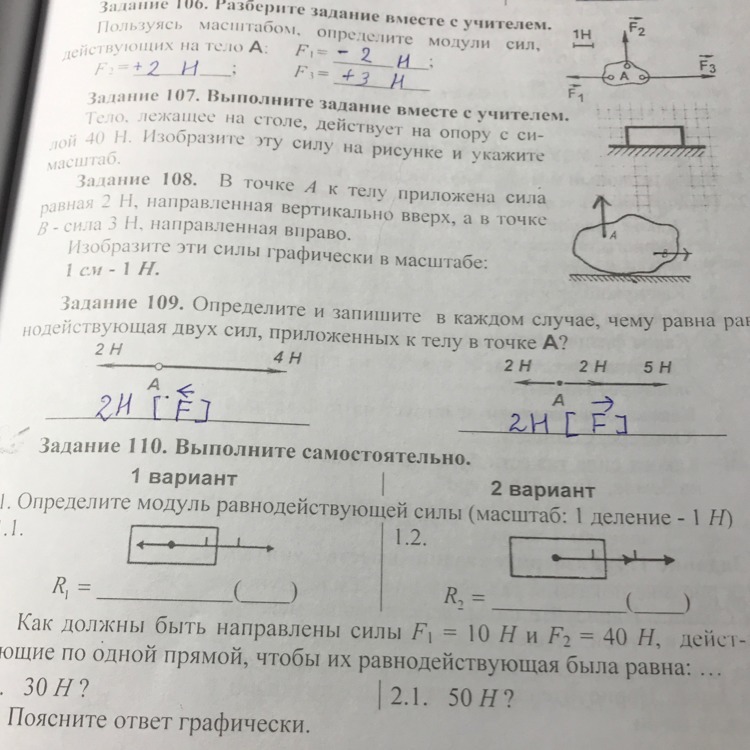1.1. R=2H, т.к. силы направлены в сторону и одна из них равна 3H (3 клеточки), а вторая 1Н (1 клеточка)