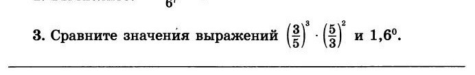 1) (3/5)³ · (5/3)² и (1,6)⁰; (3³ · 5²) : (5³ · 5²) = 3/5 = 0,6; (1,6)⁰ = 1; 0,6 < 1 ; Ответ: (3/5)³ · (5/3)² < (1,6)⁰