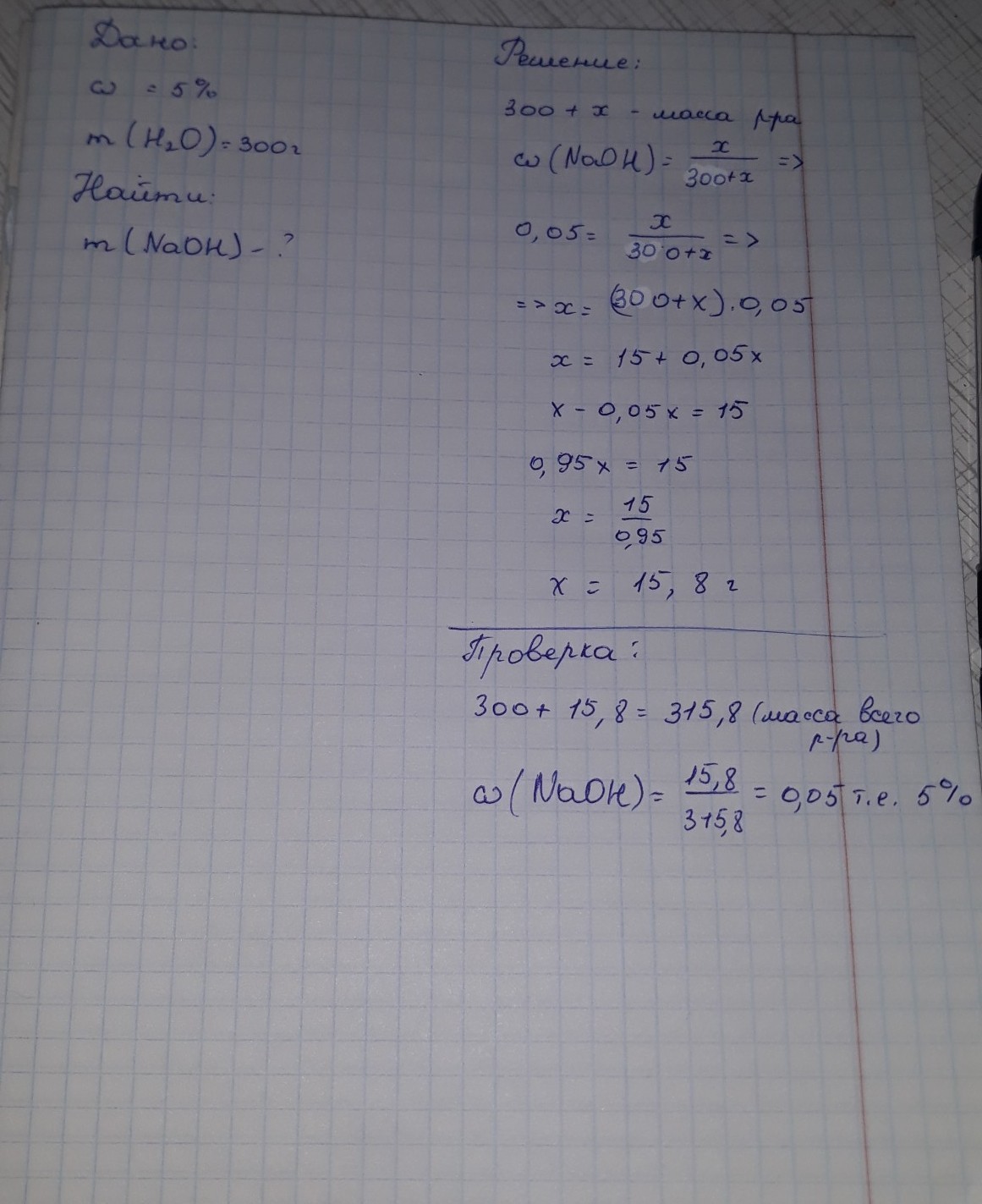 Вычислите массу гидроксида натрия необходимого для получения 5% раствора при растворении 300 г воды