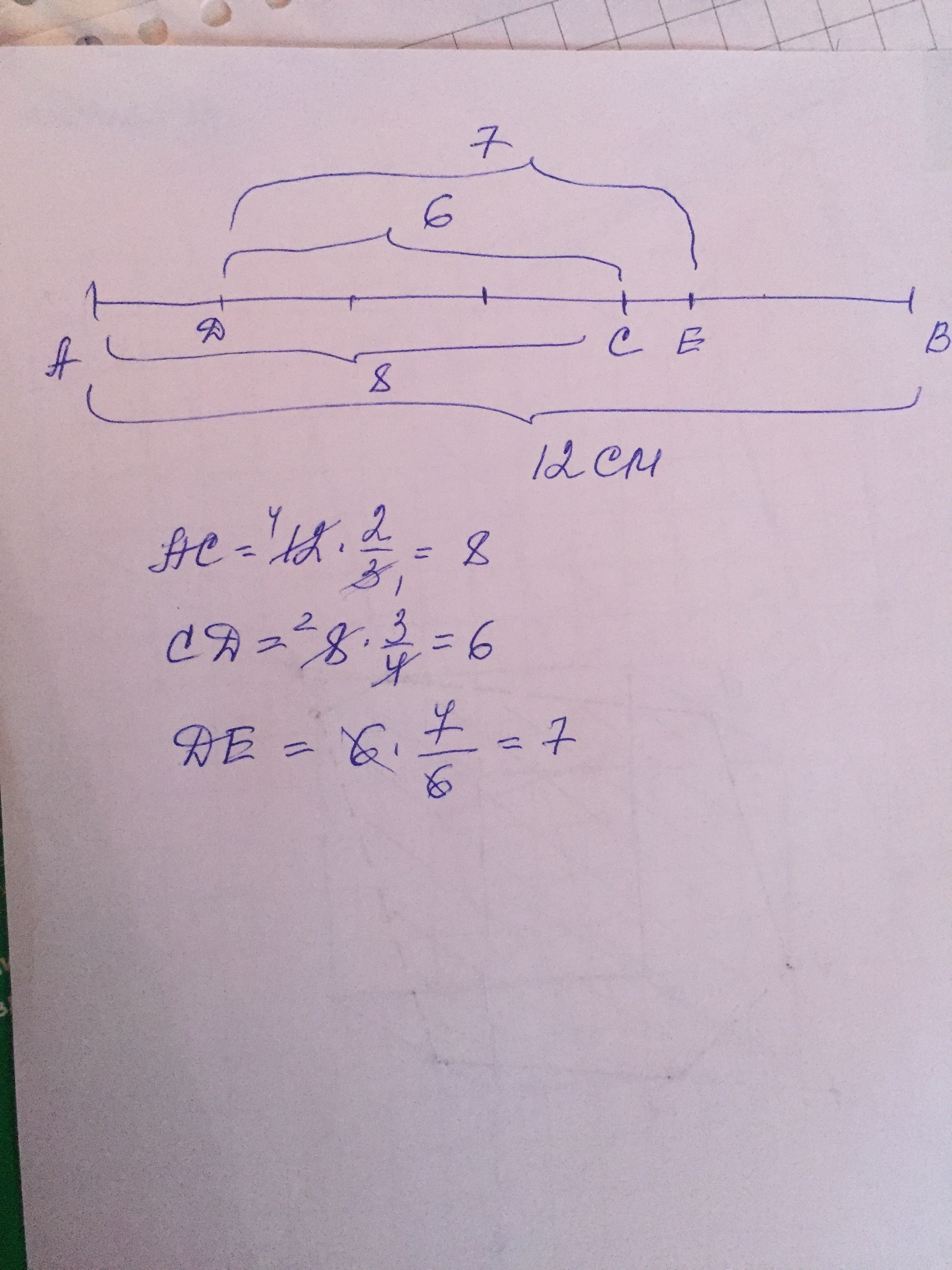 AB = 12; AC = 2/3*12 = 8; CD = 3/4*8 = 6; DE = 7/6*6 = 7