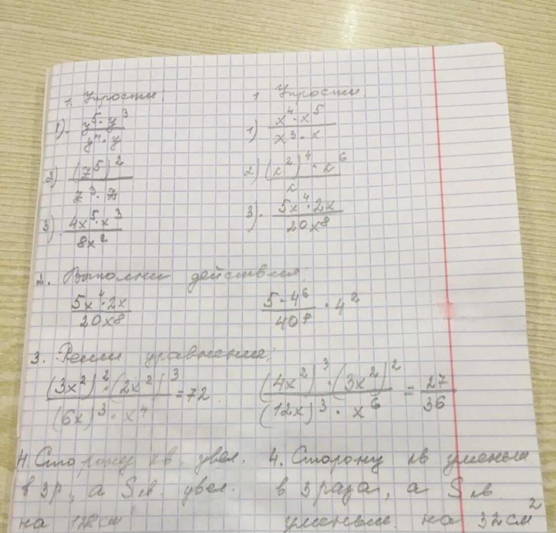 1. (x⁴ · x⁵) : (x³ · x) = x²⁰ : x⁴ = x¹⁶; 2) ((k²)⁴ · k⁶) : k = k¹⁴ : k = k¹³; 3)3) (5x⁴ · 2x) : 20x⁸ = 10x⁵ : 20x⁸ = 0,5x⁻³ = 0,5 1/x³; 4) (5 · 4⁶ ) : 40⁷) · 4² = ( (5 · 4⁶ ) :( 8⁷ · 5⁷) )· 4² = ( (5 · (2²)⁶ ) :( (2)³)⁷ · 5⁷) )· (2²)² = 1 : (5⁶ · 2⁵); 3. 1) ((4x²)³ · ( 3x²)²) : ( (12x)³ · x⁶) = 27/36 ⇒ (4³· x⁶ · 3² · x⁴) : (4³ · 3³ · x³) = 27/36; ⇒ x : 3 = 27/36 ⇒ x = 27/36 · 3 = 9/4 = 2 1/4