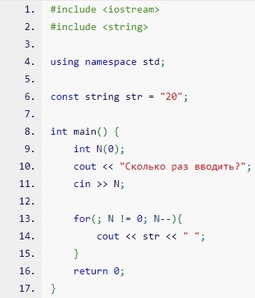 написать програму которая будет вводить число 20 в строку 20 20 20 20 20 20 20 20 20 20 . С++ программа быстрей срочно