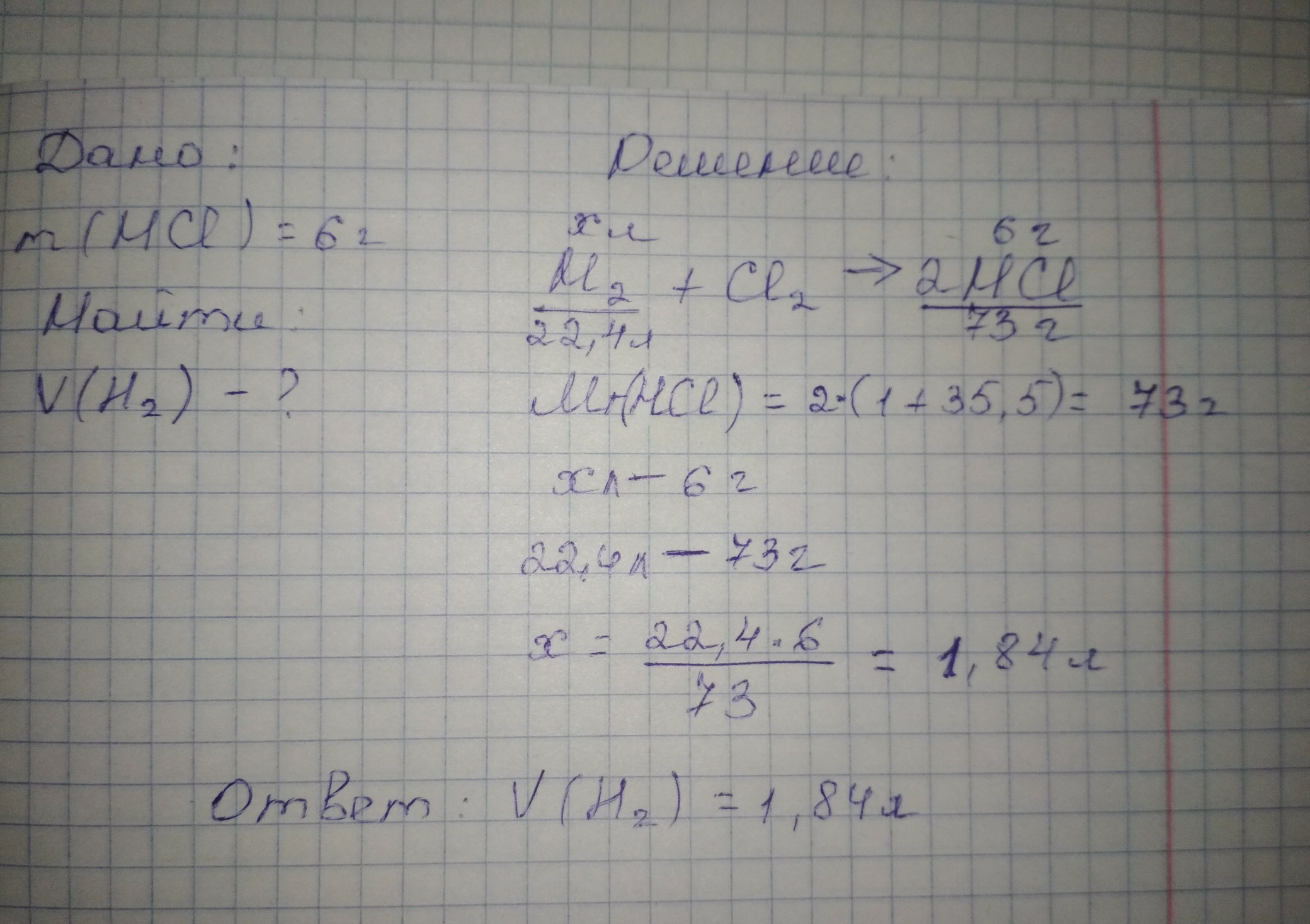 По схеме реакции H2+Cl2—HCl определить,какой объём водорода вступит в реакцию,если образовалось 6г соляной кислоты