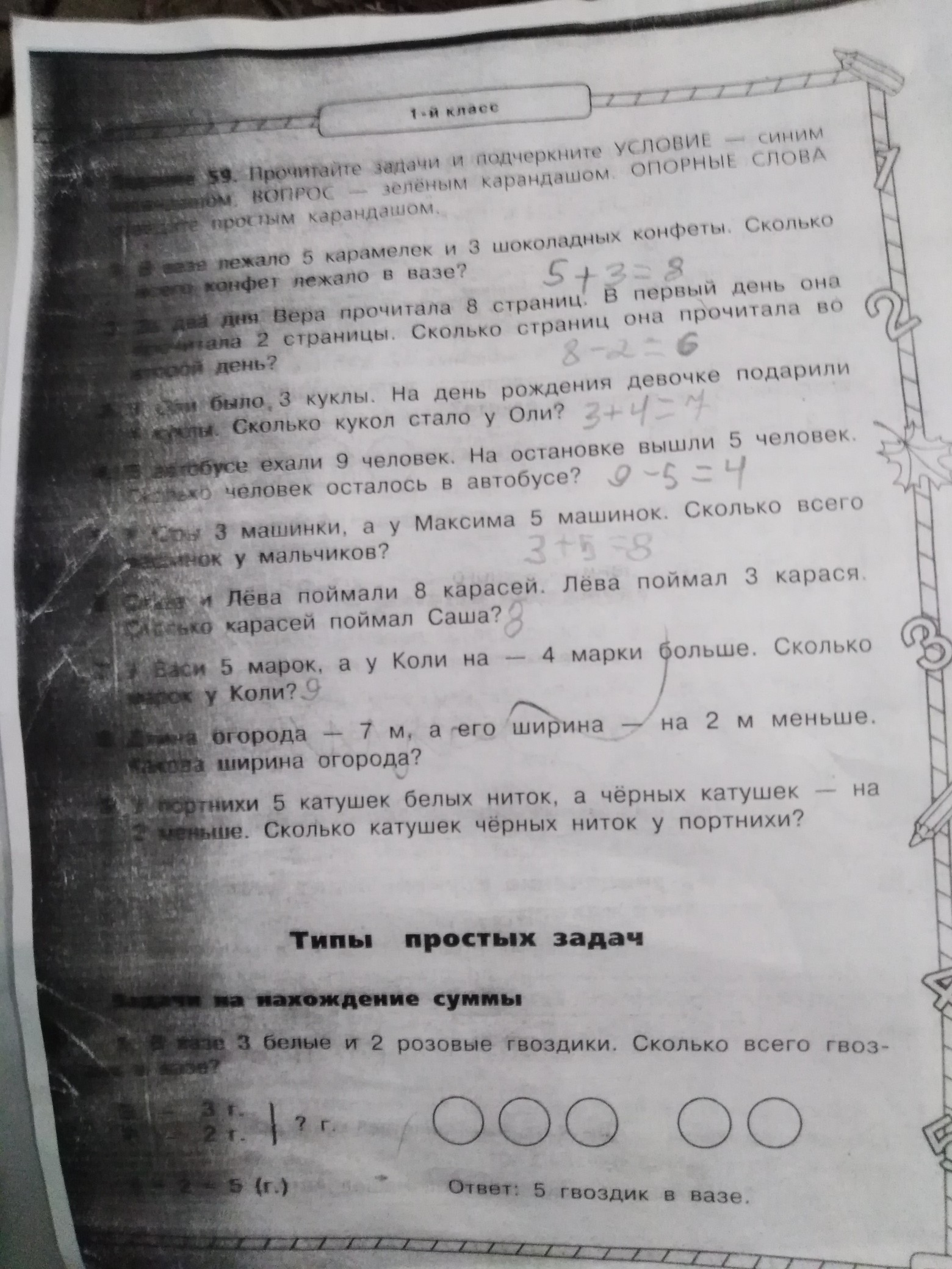 Ну, "в вазе лежало 5 карамелек и 3 шоколадных конфеты" - это условие, вопрос - "сколько всего конфет лежало в вазе?", опорные слова - 5 карамелек, 3 шоколадных конфеты, сколько всего, лежало