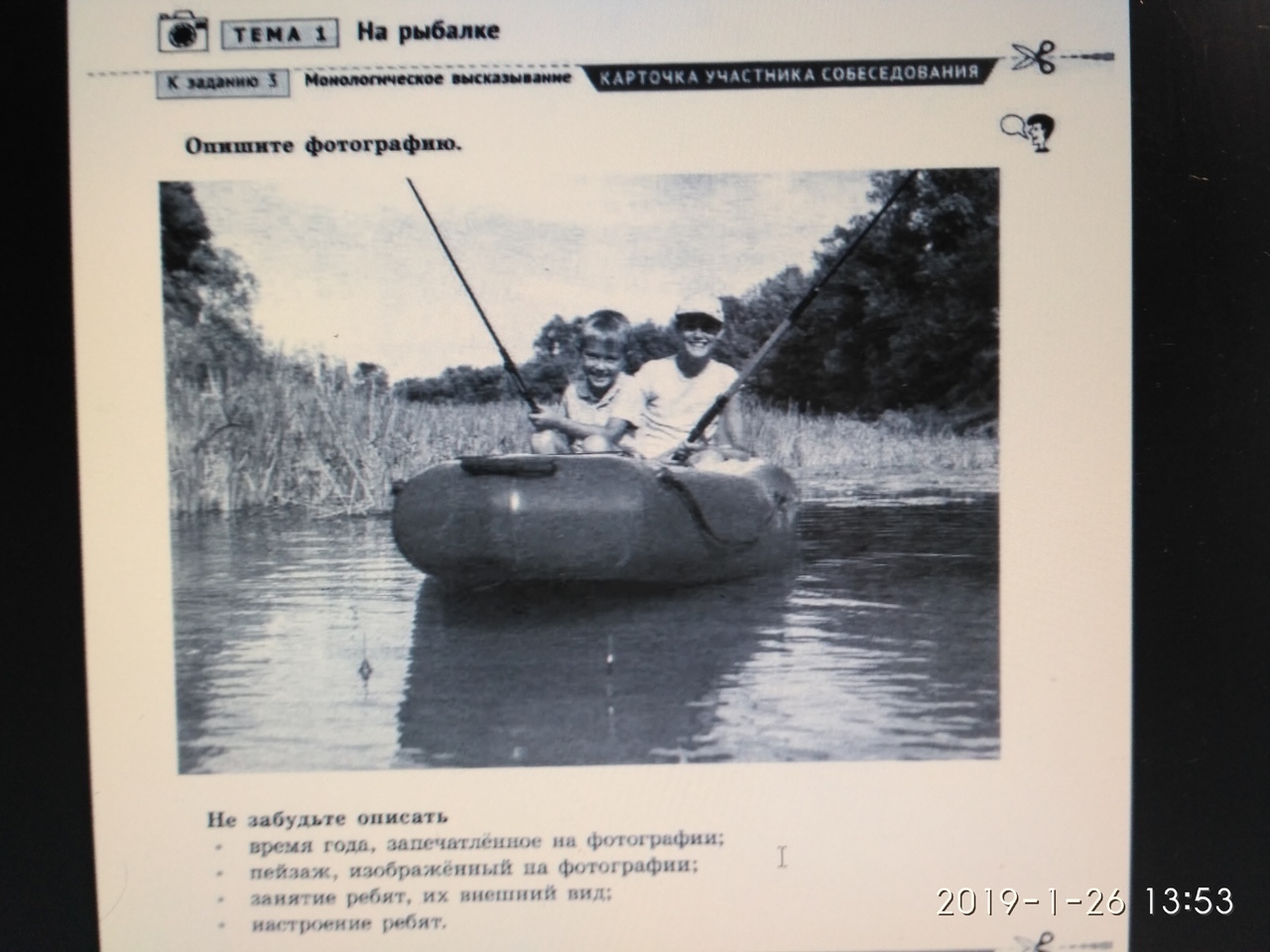 1) На чёрно-белой фотографии изображены два мальчика, рыбачащие на ставке. 2) Действие происходит летом, потому что на ребятах лёгкая одежда. 3) Они одеты в футболки и шорты. 4) На заднем плане можно увидеть лес, идущий полукругом. 5) Сам ставок оброс камышом. 6) Ребят запечатлели с удочками в руках, сидящими в надувной лодке. 7) Они радостно улыбаются. 8) Видно, что рыбачить им очень нравится. 9) Фотография вызывает положительные эмоции. 10) Хочется сесть в лодку и порыбачить вместе с ребятами.