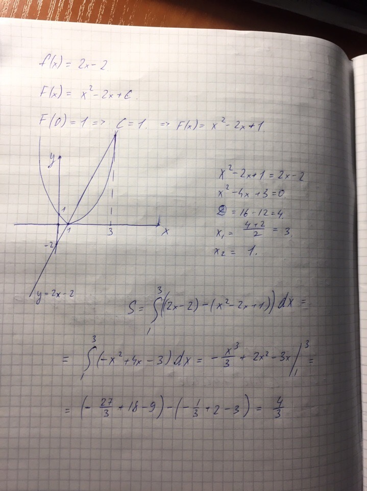 Найти площадь фигуры, ограниченной графиком функции f(x)=2x-2 и графиком ее первообразной, удовлетворяющей условию F(0)=1