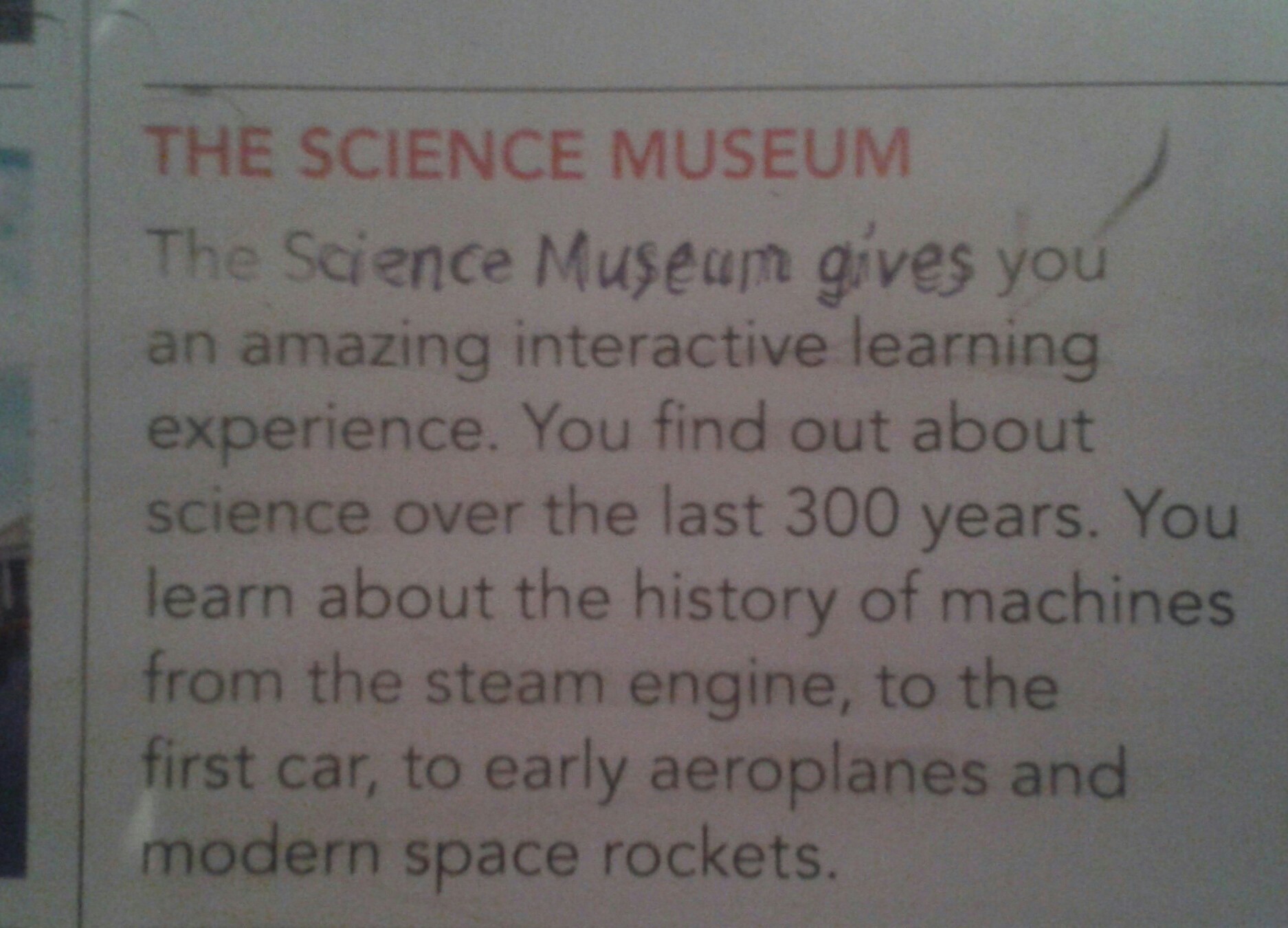 Научный музей дает удивительный опыт интерактивного обучения. Ты можешь узнать о науке около 300 лет назад. Ты узнаешь об истории машин из паровой машины, о первой машине, о ранних аэропланах и современных космических ракетах.