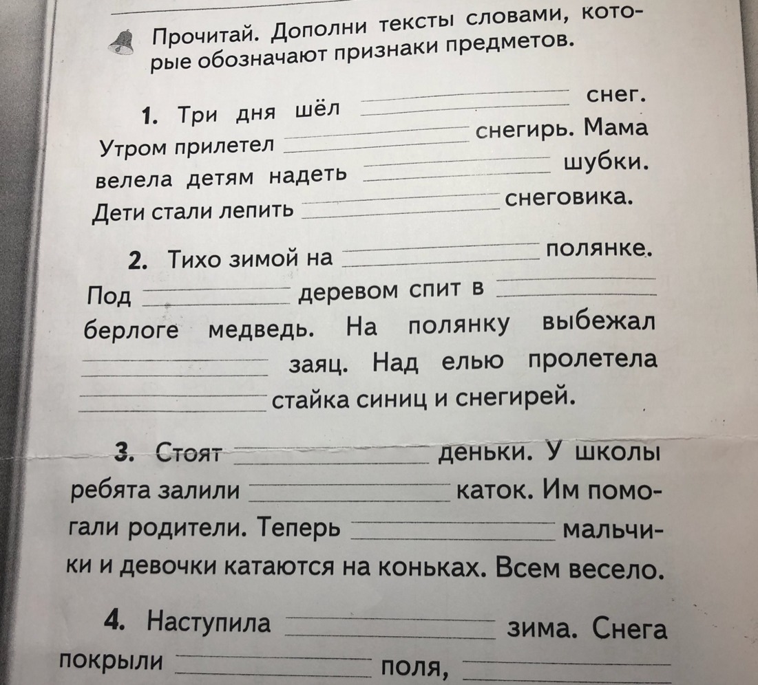 1. Три дня шёл сильный снег. Утром прилетел красивый снегирь. Мама велела детям надеть тёплые шубки. Дети стали лепить большого снеговика.