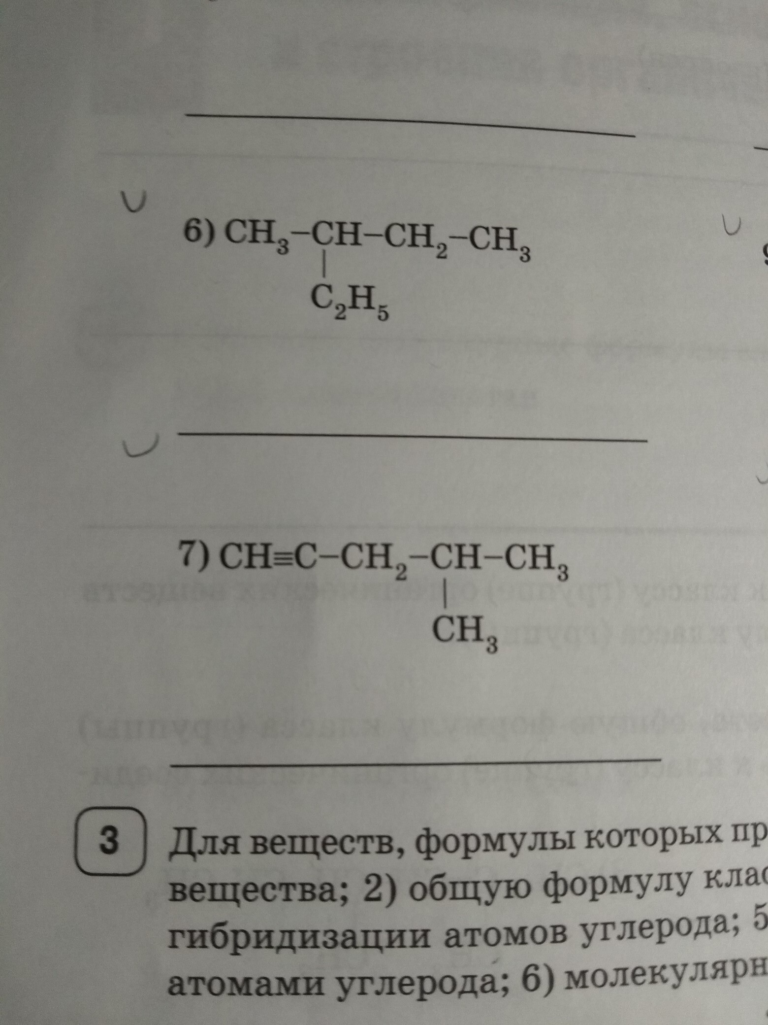 6) находим самую длинную углеродную цепь(состоит из 5 атомов, значит пентан). Все связи в молекуле С-С одинарные, значит - алкан. На 3 атоме углерода есть метиловый радикал СН3, который вначале описываем и получаем: 3-метилпентан. Это изомер гексана, относится к насыщенный углеводородам - алканам. Общая формула алканов СnH2n+2. Молекулярная формула этой молекулы С6Н14