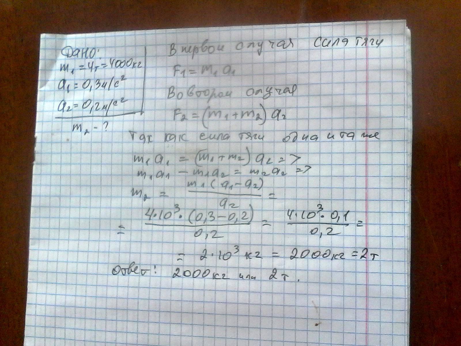 Порожний грузовой автомобиль массой 4т начинает движение с ускорением 0.3м/с/с.После загрузки при той же силе тяги он трогвется с места с ускорением 0.2м/с/с.Сколько тонн груза принял автомобиль? Сопротивлением движению пренебречь.