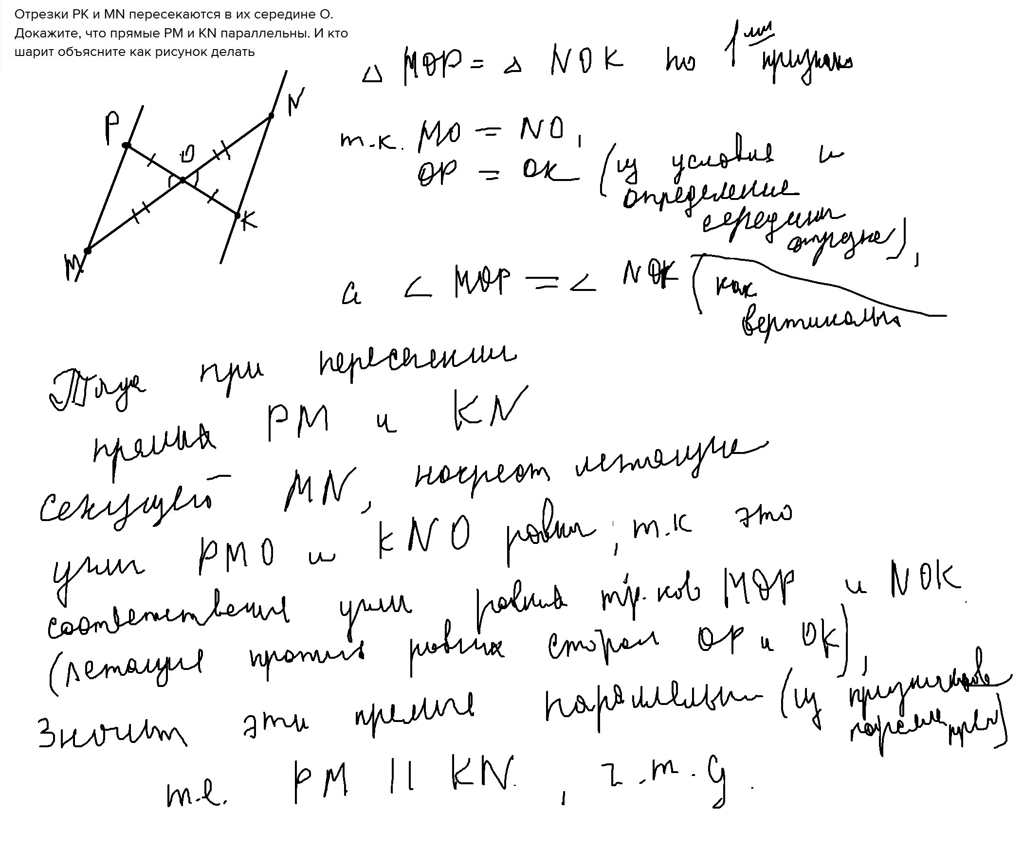 Отрезки PK и MN пересекаются в их середине O. Докажите, что прямые PM и KN параллельны. И кто шарит объясните как рисунок делать