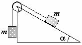 Грузы с одинаковыми массами m = 0,50 кг соединены нитью и расположены так, как показано на рисунке. Определить силу давления Fна ось блока, если ? = 0,3 — коэффициент трения между наклонной плоскостью и лежащим на ней грузом, а угол плоскости с горизонтомα = 30°. Нить и блок считать невесомыми, трением в оси блока пренебречь.