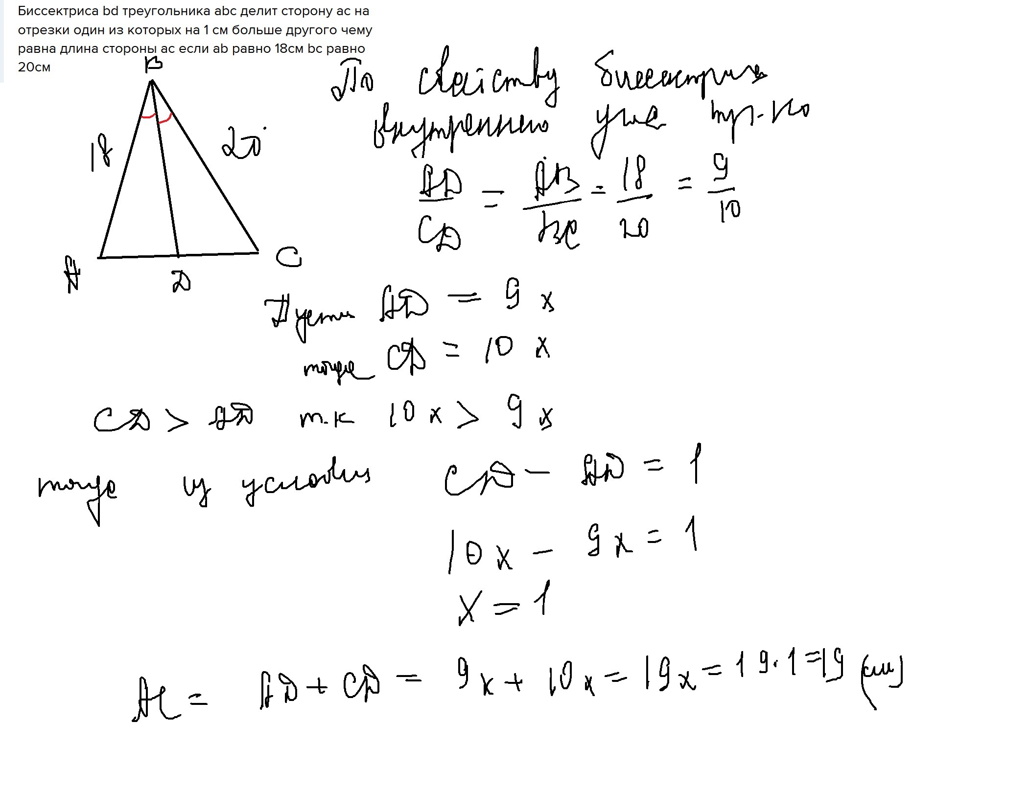 Бисcектриса bd треугольника abc делит сторону ac на отрезки один из которых на 1 см больше другого чему равна длина стороны ac если ab равно 18см bc равно 20см