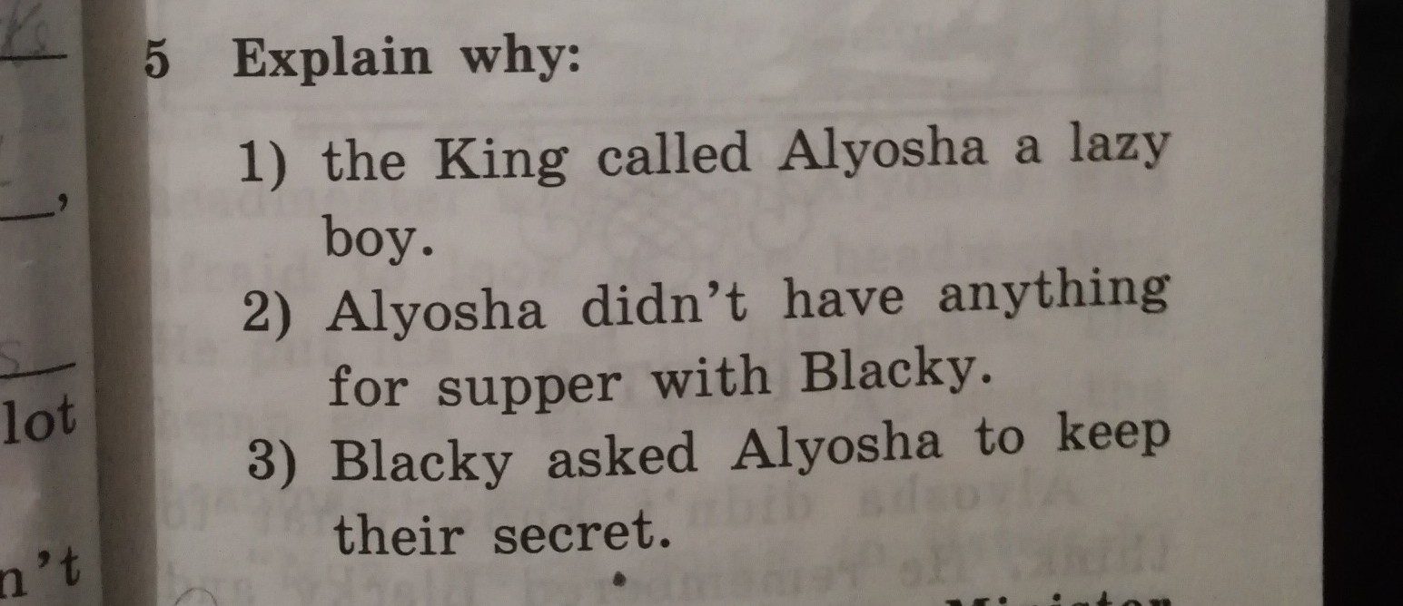 1) Король позвал Алёшу лентяй. 2) Алёша нечего не ел на ужин с чёрным. 3) Чёрный попросил Алёшу сохранить их тайну.