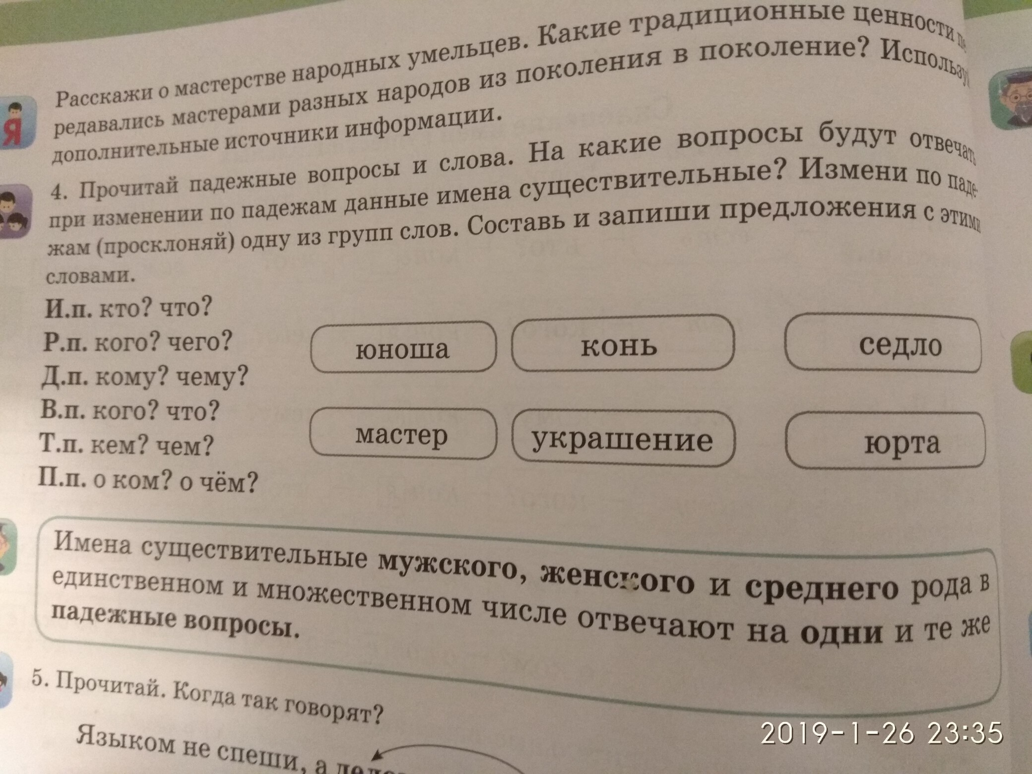 Мой брат - юноша. Я приехал на ферму, там были кони. На коне было надето седло. У мамы есть драгоценное украшение.У северных народов местом проживания является юрта