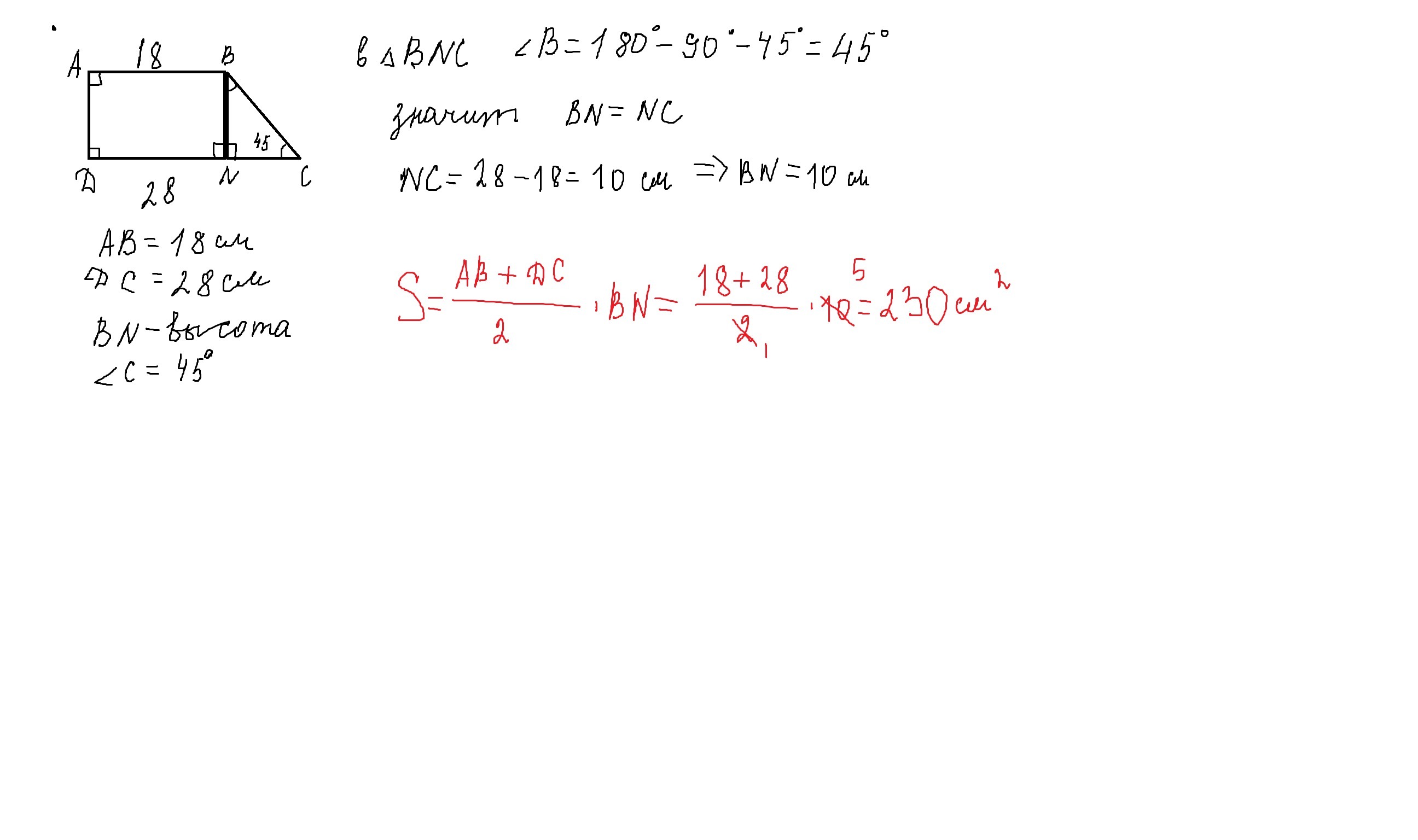 проведем высоту ВN ,найдем ее и посчитаем площадь трапеции по формуле