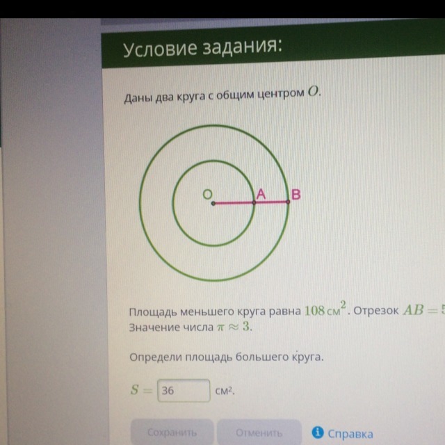 1. Зная площадь S меньшего круга, равного 108 см², мы можем определить радиус меньшего круга, который будет равен отрезку OA. Воспользуемся формулой для расчёта радиуса меньшего круга: