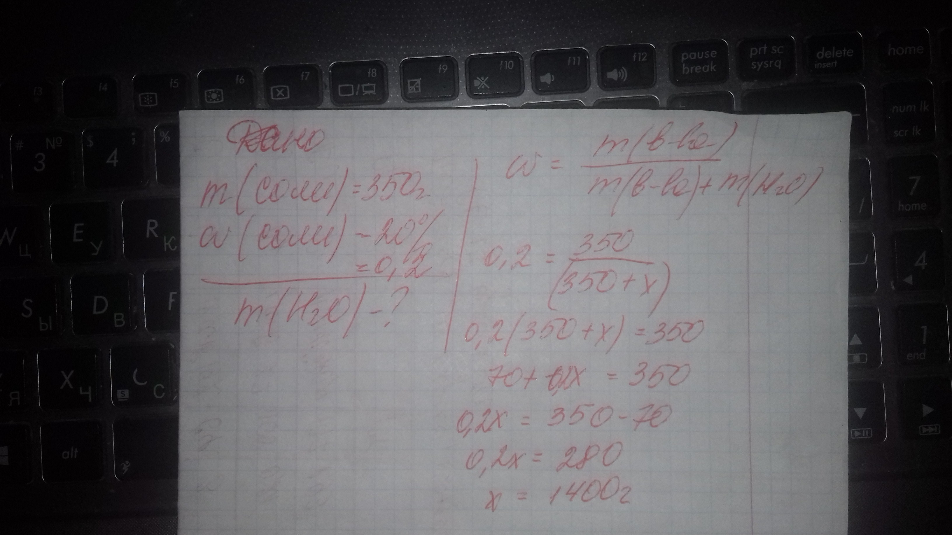 Имеется раствор соли массой 350г. Рассчитайте массу воды, которую надо взять, чтобы получить раствор с массовой долей соли 20%. Пожалуйста помогите, срочно нужно решить.