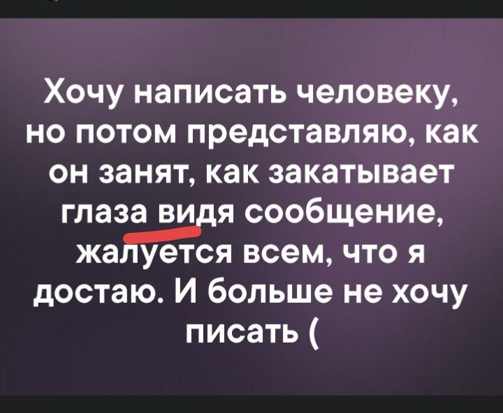 Хочу написать человеку,но потом представляю,как он занят,как закатывает глаза,видя сообщение,жалуется всем,что я достаю.И больше не хочу писать