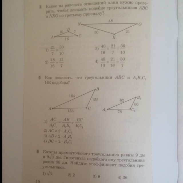 4-3(по трем сторонам),5-1,6-2(следуя теореме Пифагора, найдем гипотенузу= 18 дм, и тк первая гипотенуза =36 дм, то 36/18=2 ,ответ 2