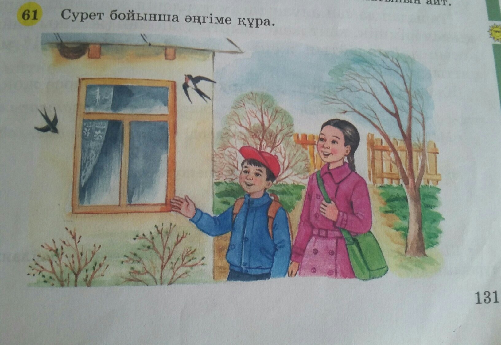 Мен эпкем екеуiмiз эжемiздiн уйiHe келгенде, кенет карлыгаштын уясын кордiк. Уянын касында карлыгаштар ушып жур екен. Бiз оларга жакыннан келiп карасак, карлыгаштын балапаны жерге кулап калган ,эпкем екеуiмiз балапанды уясына салдык жэне жем бердiк.Кешке эжеке болган жайды баяндап бердiм.Эжем машан дурыс iстегенiмдi айтты. Эрбiр адам ан-кустарга комек беруге тиic