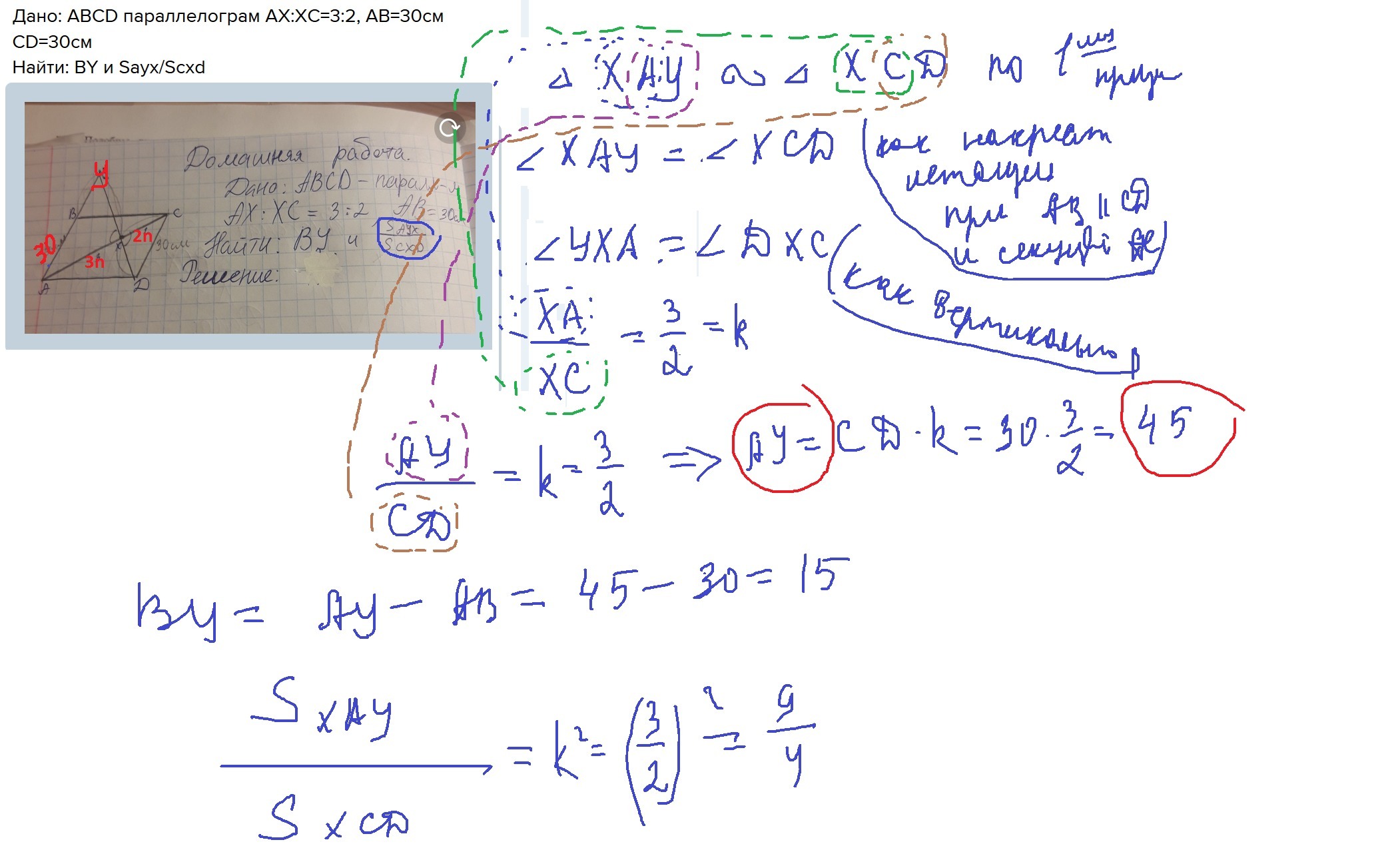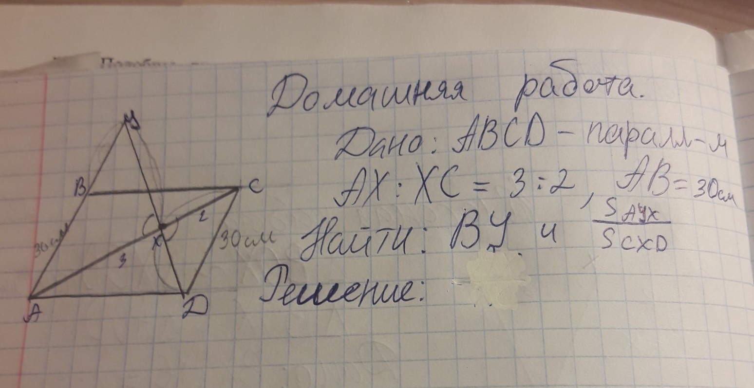 Дано: ABCD параллелограм AX:XC=3:2, AB=30см CD=30см