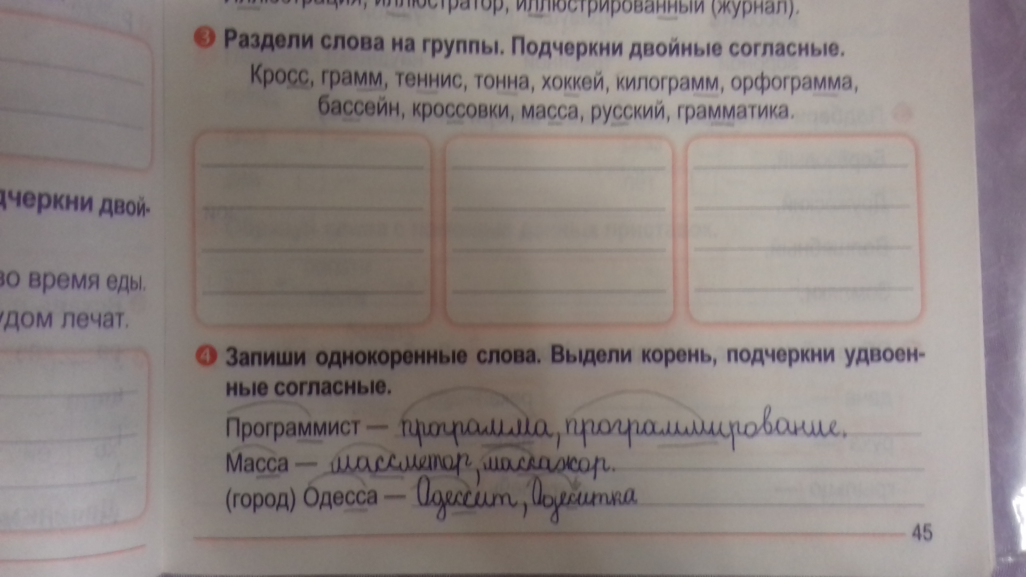 1. Грамм, килограмм, кросс. 2. Теннис, бассейн, хоккей, грамматика, кроссовки, русский. 3. Орфограмма, тонна, масса.
