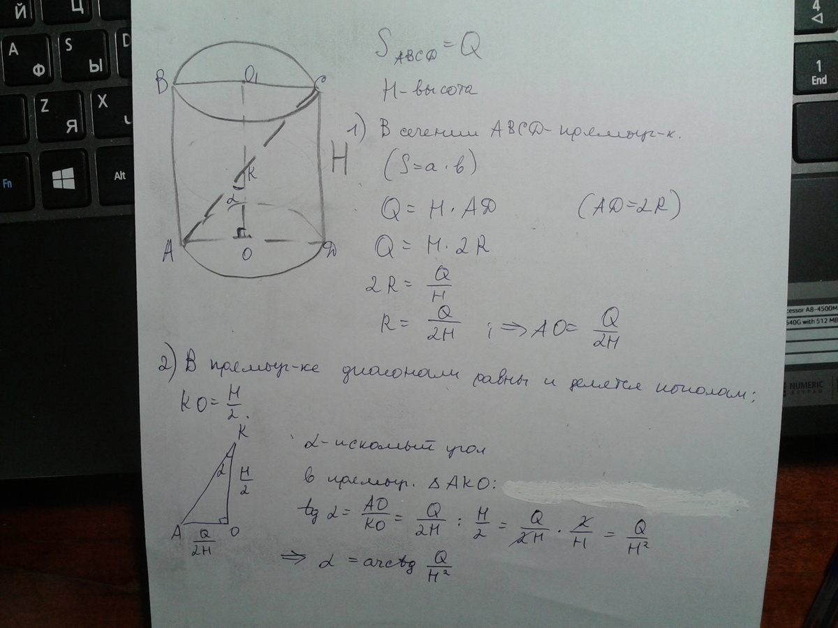 Площадь сечения, проведенного в цилиндре, перпендикулярно основанию, равна Q. Найдите угол между диагональю сечения и осью цилиндра, если высота цилиндра равна H.
