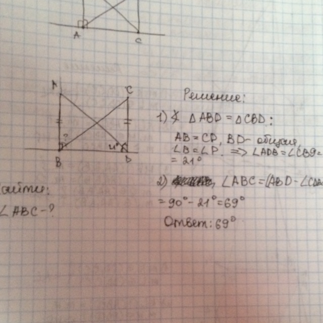 Точки A и C расположены по одну сторону от прямой, к которой от обеих точек проведены перпендикуляры AB и CD равной длины. Определи величину угла∡ABC, если∡ADB=21°.