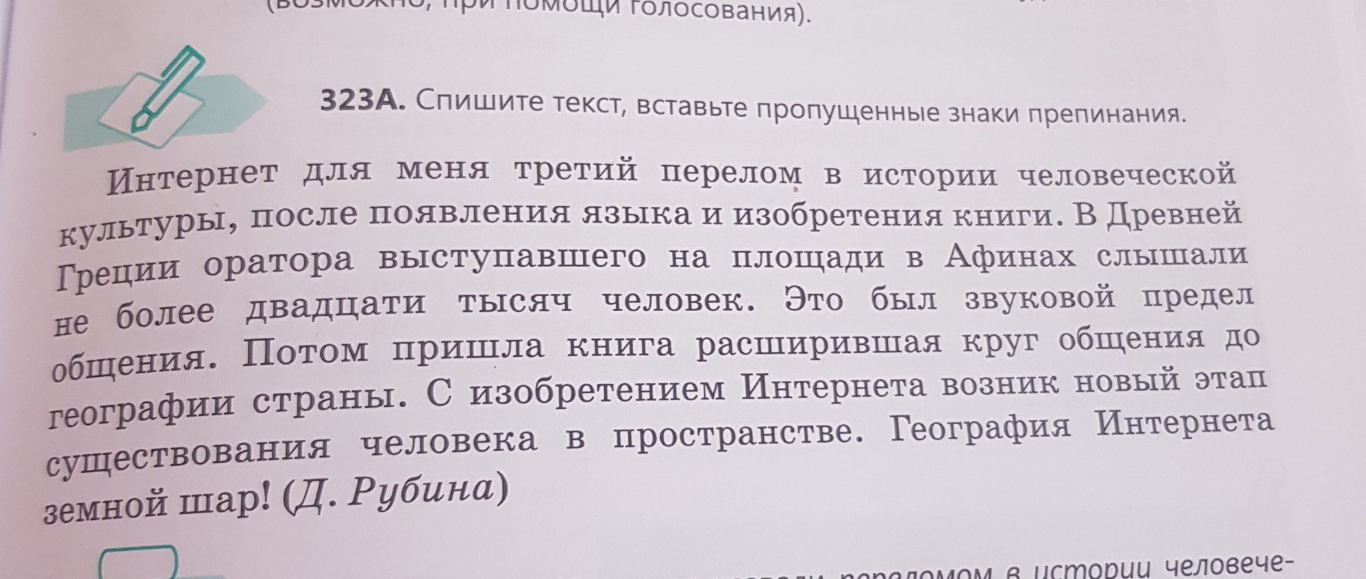 Интернет для меня третий перелом в истории человеческой культуры , после появления языка и изобретения книги. В Древней Греции оратора, выступавшего на площади в Афинах, слышали не более двадцати тысяч человек. Это был звуков предел общения. Потом пришла книга, расширившая круг общения до географии страны. С изобретением Интернета возник новый этап существования человека в пространстве. География Интернета - земной шар!(Д. Рубина).