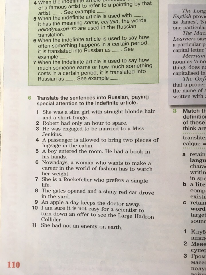 1 Она была стройной девочкой с прямыми светлыми волосами и короткой бахромой. 2 Роберту оставалось всего час. 3 Он был помолвлен, чтобы жениться на мисс Дженкинс. 4 Пассажиру разрешено провозить два места багажа в салоне. 5 Мальчик вошел в комнату. В руках у него была книга. 6 В настоящее время женщина, которая хочет сделать карсер в моде, должна следить за ее весом. 7 Она Рокфеллер, предпочитающая простую. 8 Ворота открылись, и во дворе въехала блестящая красная машина. 9 Яблоко в день держит доктора подальше. 10 Я уверен, что ученому нелегко отклонить предложение увидеть Большой Адрон. 11 У нее не было врага на земле.