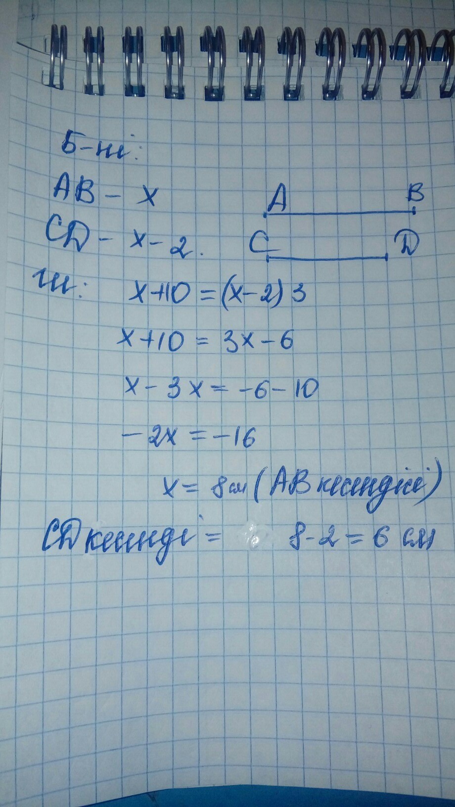 АВ кесіндісінің ұзындығы СD кесіндісінің ұзындығынан 2 см артык.Егер АВ кесіндісінің ұзындығын 10см-ге,ал CD кесіндісіниң ұзындығын 3 есе арттырса,онда натижеси тең болады. АВ жане CD кесінділерінің ұзындығын табындар.көмектесініздерші