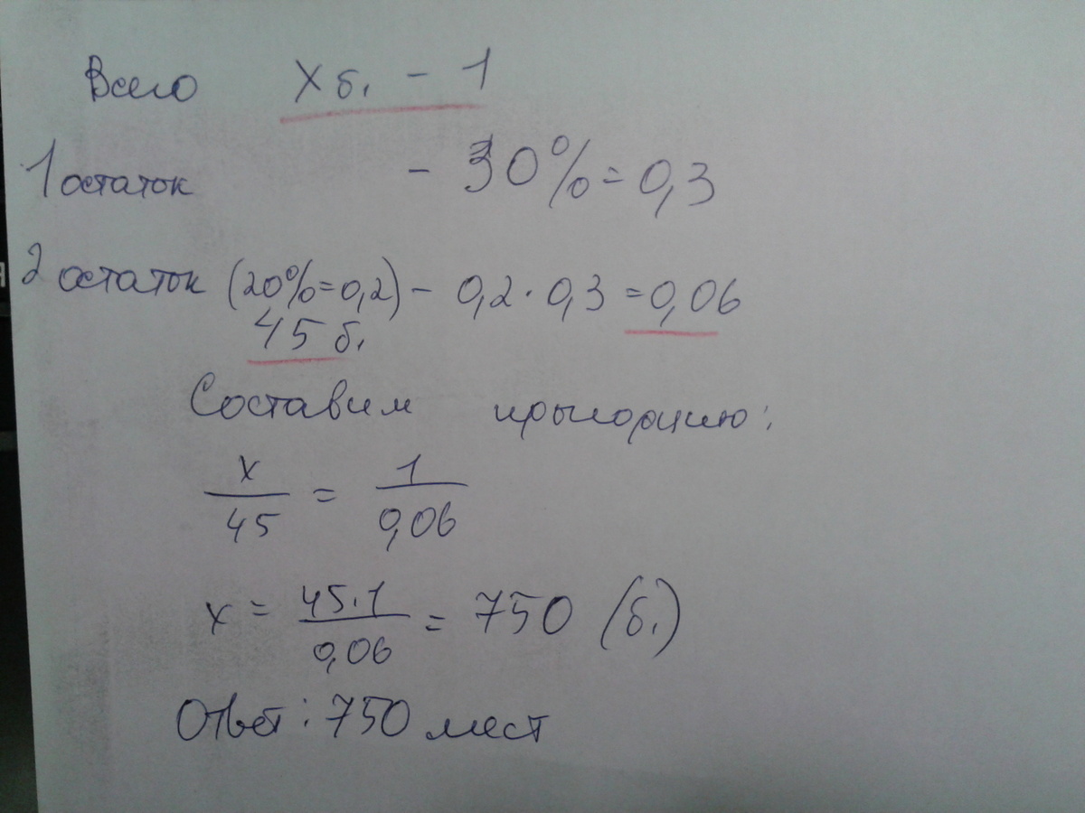 За час до киносеанса оставались непроданными 30% всех билетов. Но через полчаса к кинотеатру подъехала группа туристов и купила 45 билетов,что составило 20% билетов,оставшихся в кассе.Сколько всего мест в кинотеатре?