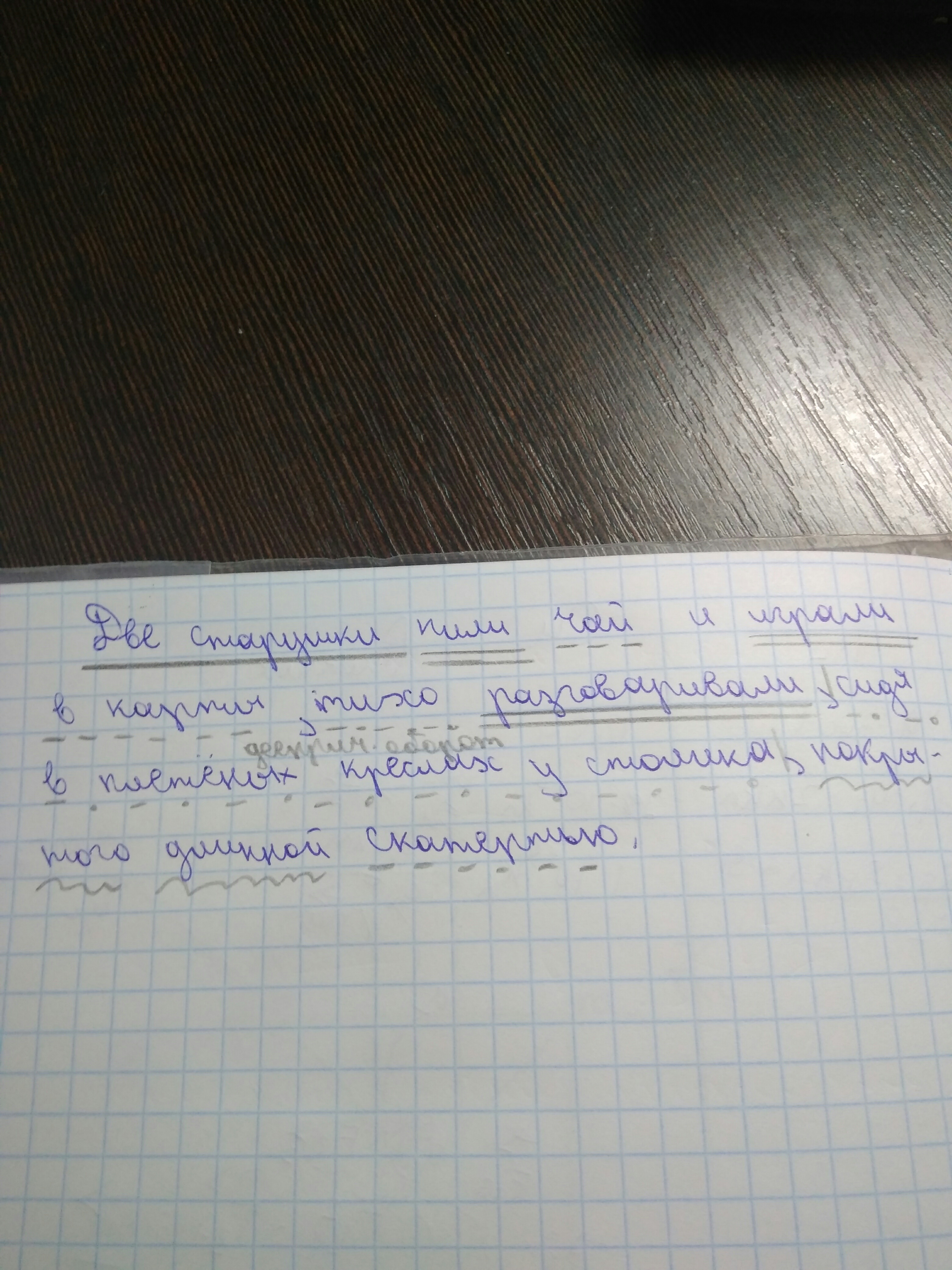 Две старушки пили чай и играли в карты,тихо разговаривали,сидя в плетёных креслах у столика, покрытого длинной скатертью.
