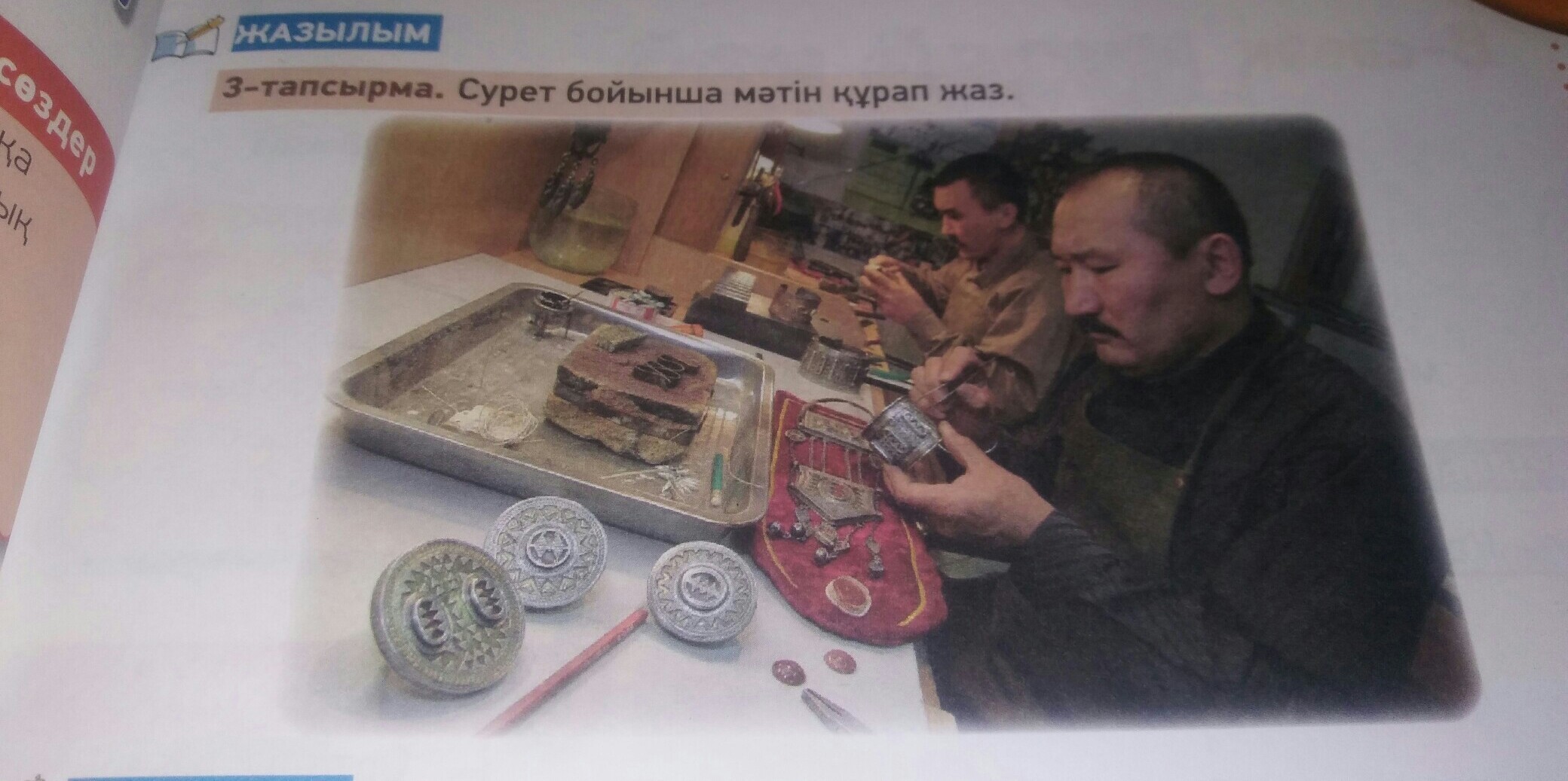 Бұл суретте зергершілер қазақ қыздарының бұйымдарын жасап жатыр. Қазақ қыздары өте көп əшекей таққан. Соның ішінде шашбау .Қыздарға шашбауды тік жүру үшін таққан. Егер олар тік жүрмесе олардың шашбауы шықырлайтын болған.Ал қазақ халқында қыздардың шашбауы ешқашан дыбыс шығармауы керек деген